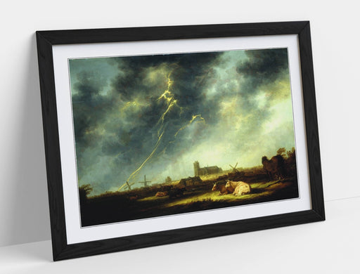 This framed wall art poster features the iconic Aelbert Cuyp painting, Thunderstorm Over Dordrecht, expertly printed on heavy matte paper with arch...