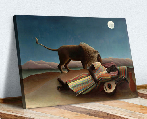 View full detailsThis canvas wall art features The Sleeping Gypsy print by Henri Rousseau, expertly crafted to bring vibrant wall decor and timeless charm to your h...