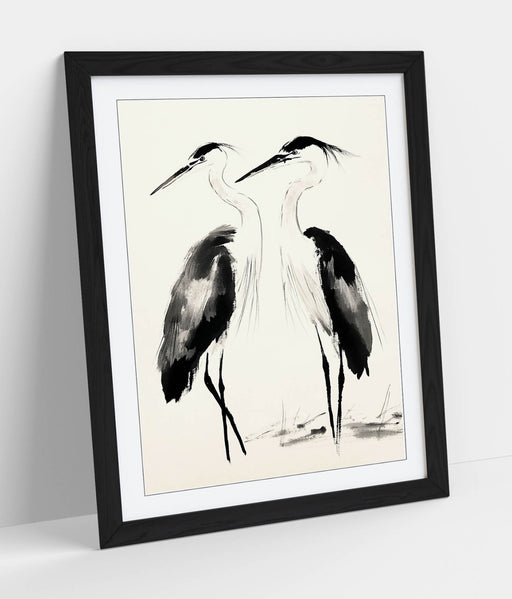 Framed Wall Art | Two Heron Birds Oriental Ink Style Poster Print - Handmade Decor