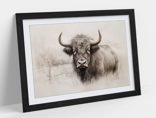Highland Cow Wall Art – Framed Charcoal Sketch Print with Natural Wood Frame