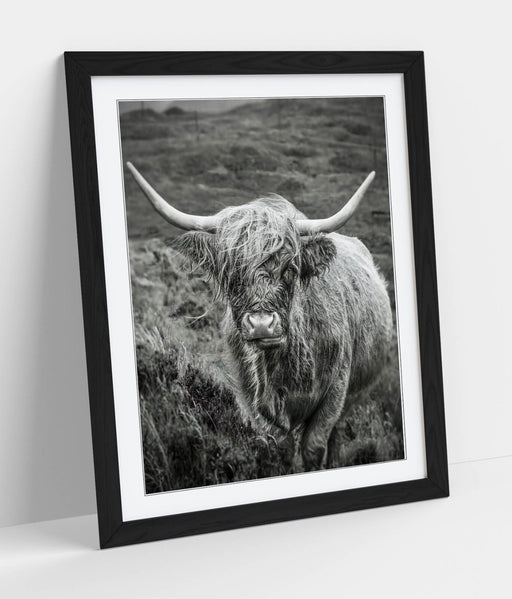 Highland Cow Wall Art – Black and White Poster with Natural Wood Frame | UK Handmade