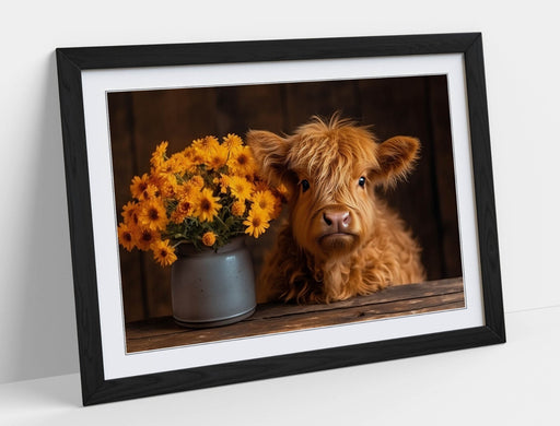 Baby Highland Cow Art – Framed Wall Art Poster Print with Flowers | UK Handmade