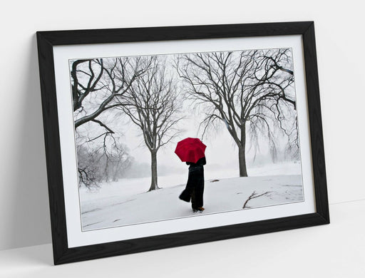 Framed Art Print - Red Umbrella Artwork | Snow Scene Print With Wood Grain Frame