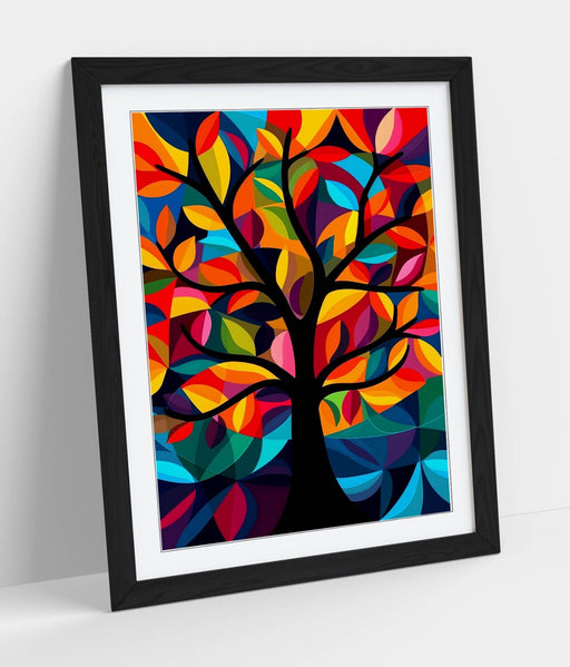 Framed Wall Art - Multi Colour Abstract Tree Print With Woodgrain Frame